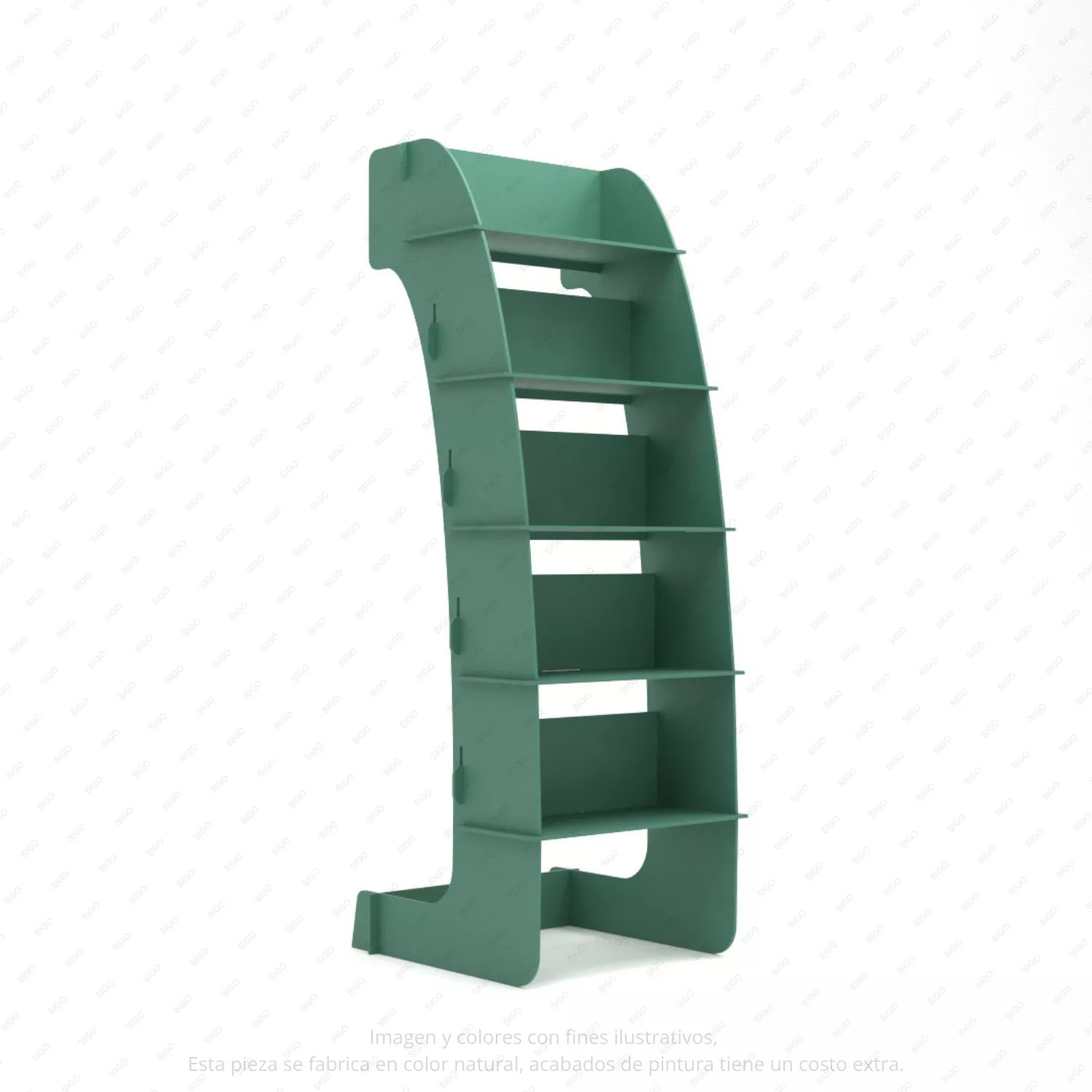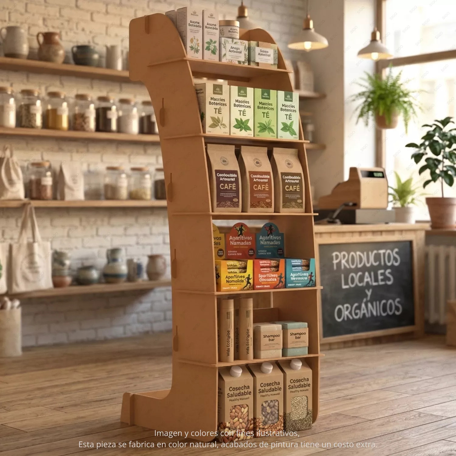 Fabricado en MDF de alta calidad, este exhibidor ofrece excelente resistencia estructural y durabilidad. Su diseño curvo proporciona estabilidad y un estilo moderno, mientras que su acabado puede personalizarse con pintura para adaptarse a la identidad visual del negocio. El corte preciso tipo CNC garantiza ensambles firmes y un acabado limpio.
