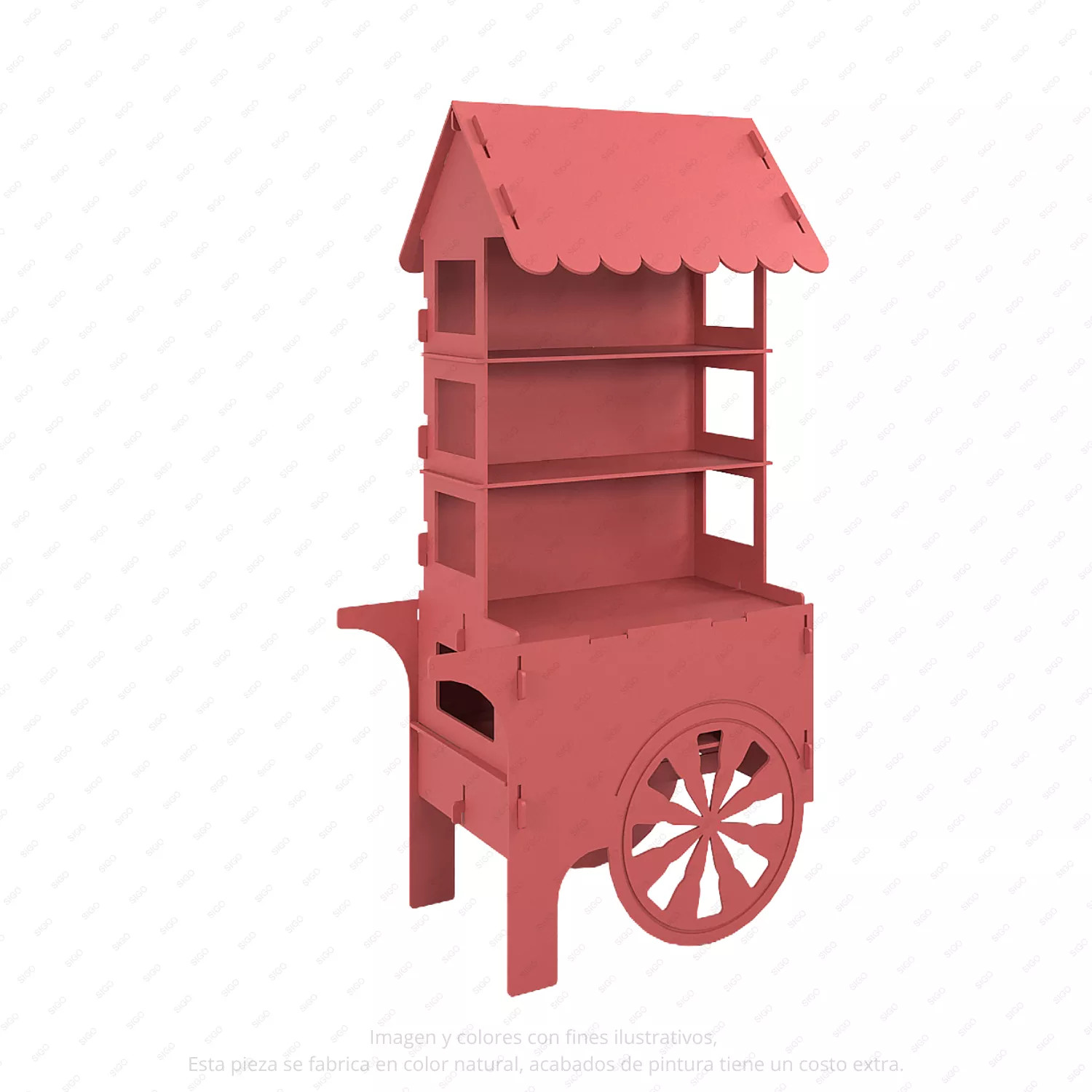 Exhibidor tipo carreta con techo fabricado en MDF, ideal para presentación atractiva de productos en puntos de venta. Su diseño decorativo y funcional permite organizar mercancía de forma ordenada y llamativa. Perfecto para impulsar ventas y destacar productos en espacios comerciales.