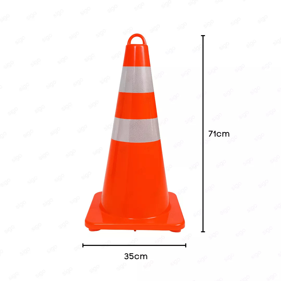 Cono reflectante de alta resistencia fabricado en PVC duradero, diseñado para señalización vial y control de áreas de riesgo. Incorpora bandas reflectivas para alta visibilidad 360° y argolla superior para fácil manipulación. Ideal para mejorar la seguridad en entornos viales, industriales y de obra.