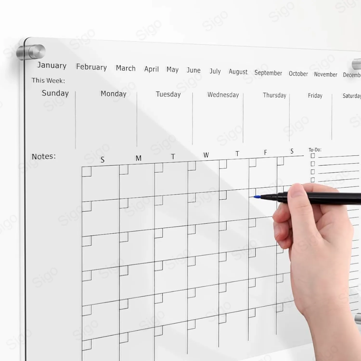 "Optimiza tu tiempo y decora tu espacio con el Calendario Organizador de Acrílico Transparente de SIGO. Su diseño innovador y sostenible es perfecto para quienes buscan una solución elegante y eficaz para gestionar sus actividades diarias."
