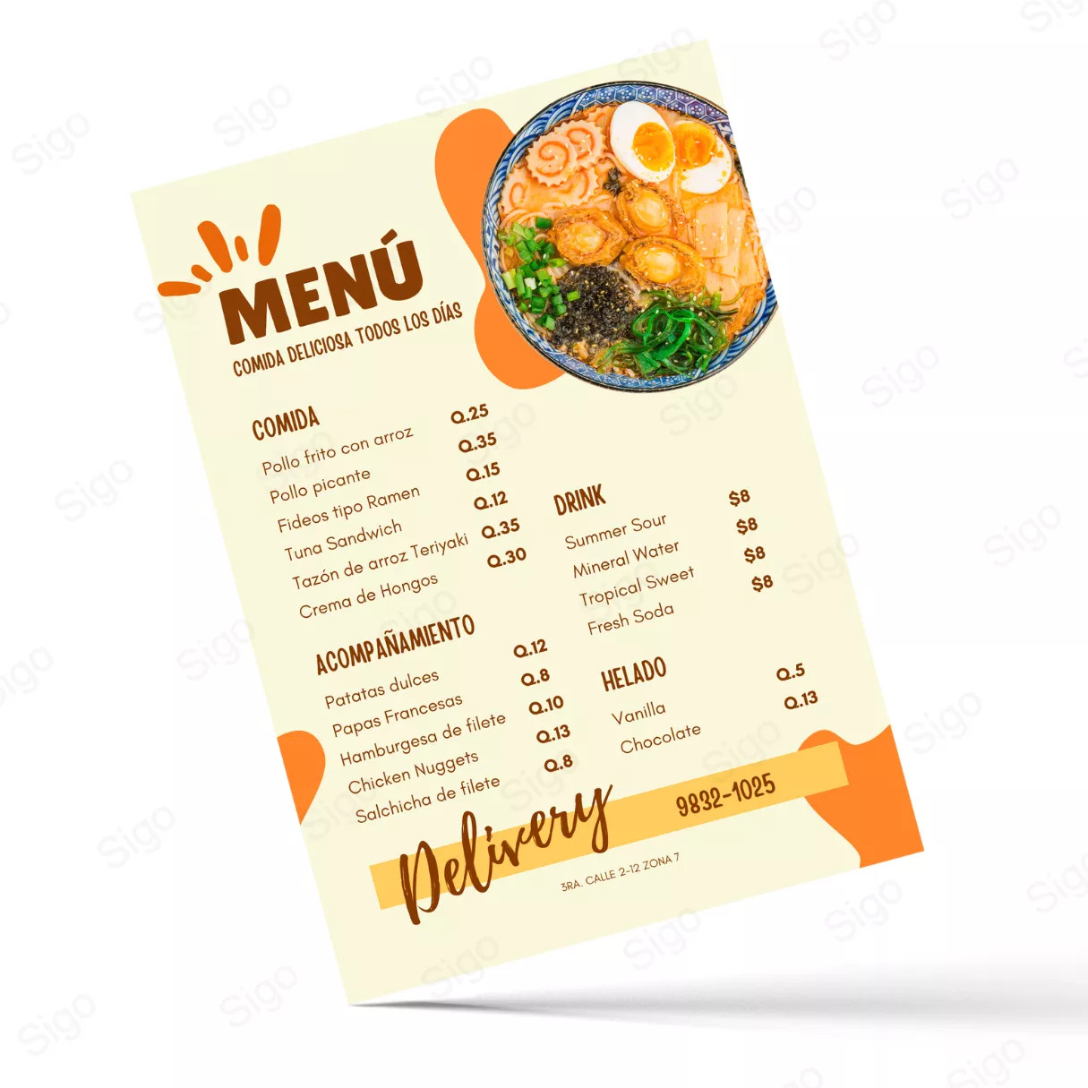 Menú Restaurante formato A4, diseñado para resaltar cada delicia culinaria. Con una presentación clara y atractiva, este menú es la herramienta perfecta para guiar a tus clientes a través de una experiencia gastronómica inolvidable.