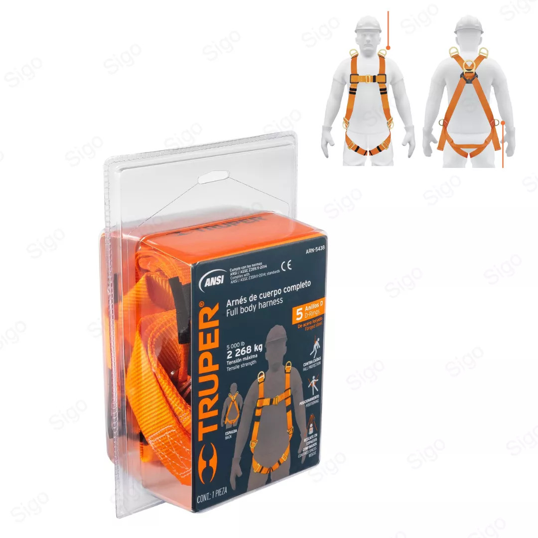 Arnés de Seguridad Cuerpo Completo con 5 Puntos Marca Truper es un equipo de protección personal indispensable, diseñado para la industria en general y la construcción. Con una carga máxima de trabajo de 140 kg, este arnés incorpora cintas de poliéster 100% y 5 anillos "D" de acero forjado, distribuidos estratégicamente para una seguridad óptima.