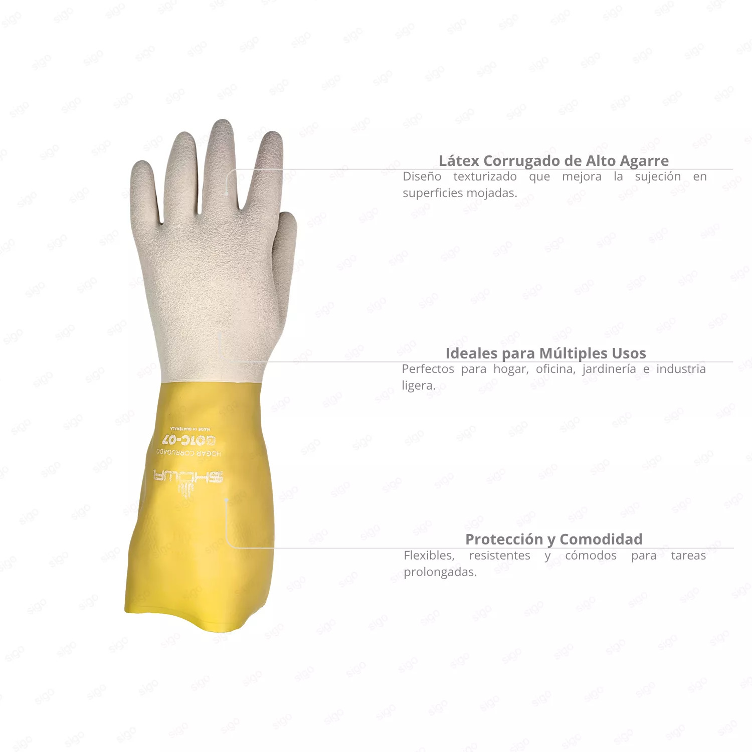 Guante de Hule Látex Corrugado SHOWA diseñado para brindar excelente agarre y protección en tareas de uso general. Su acabado texturizado mejora la sujeción en superficies mojadas y ofrece gran comodidad. Ideal para labores domésticas, de oficina, jardinería e industria ligera.