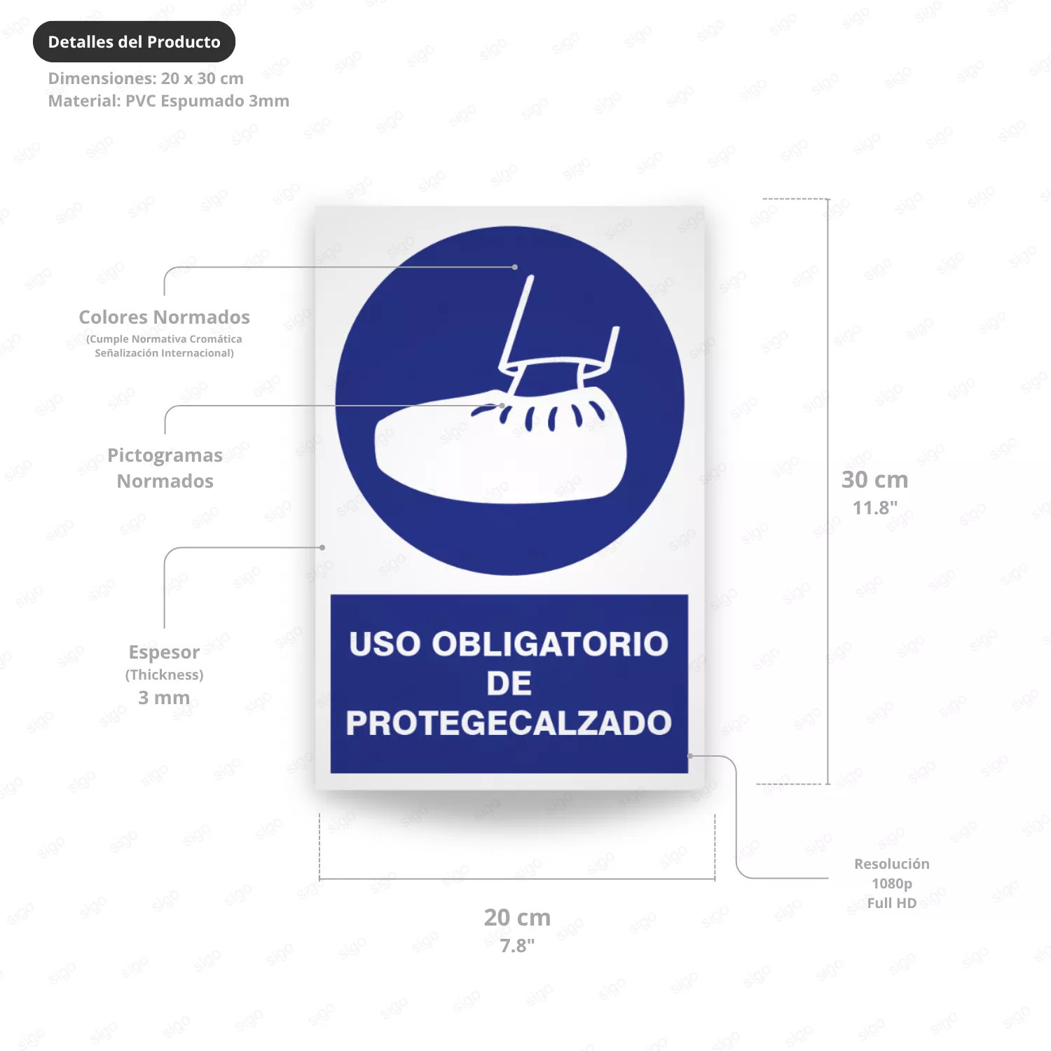 Rótulo de Obligación - Uso obligatorio de protegecalzado | Cod. OB-141, disponible en diversos materiales. Fabricado según parámetros normativos NRD2 de CONRED. Disponible en varios tamaños. Ideal para oficinas, edificios comerciales, ambientes industriales y más.