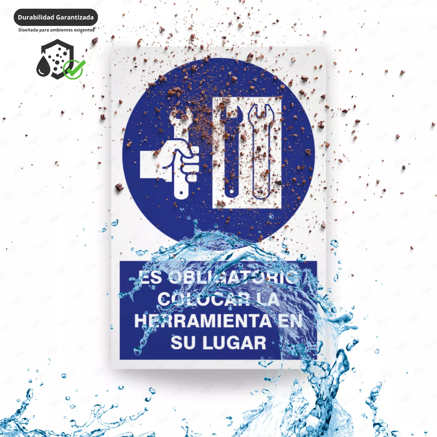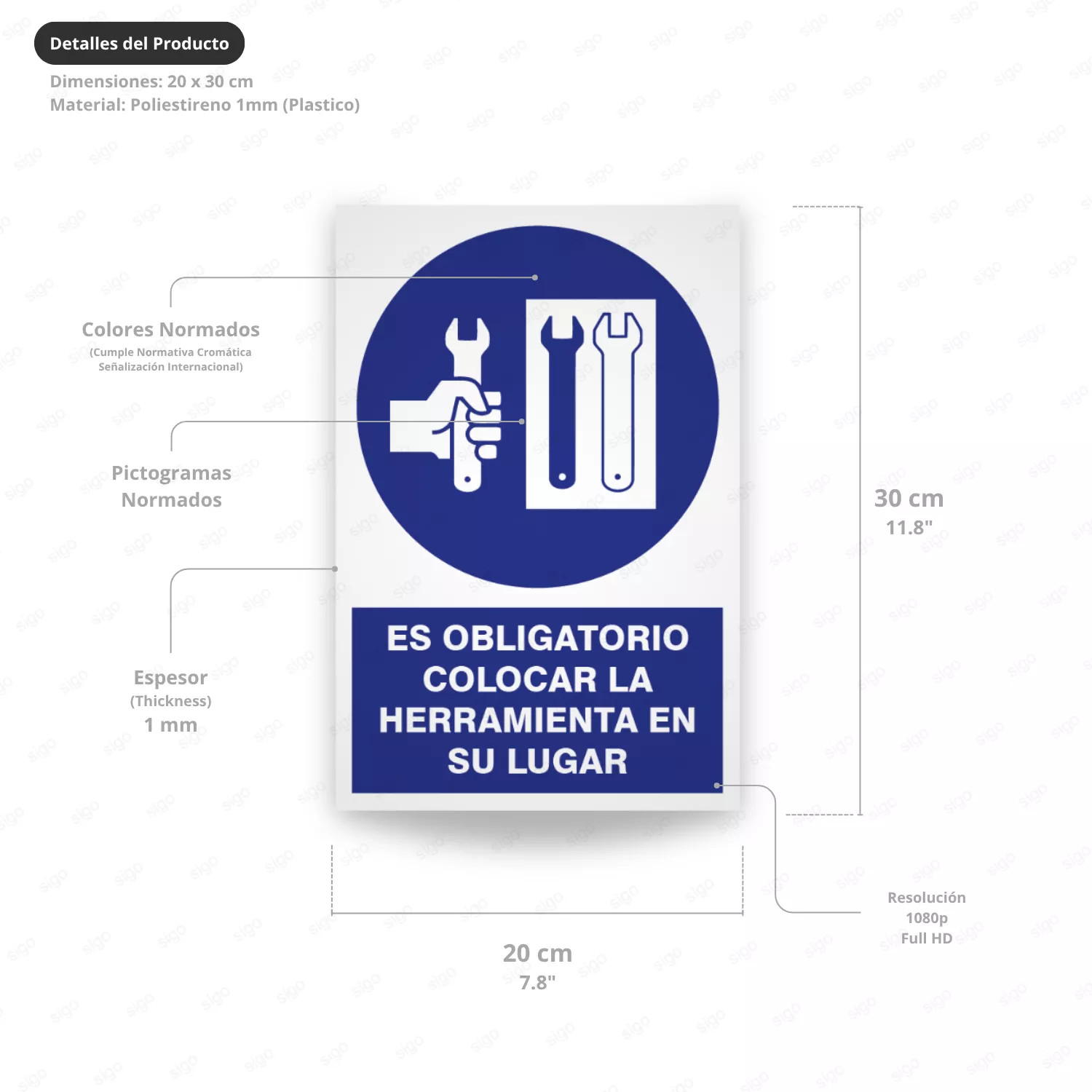 Rótulo de Obligación - Obligatorio colocar la herramienta en su lugar | Cod. OB-165, disponible en diversos materiales. Fabricado según parámetros normativos NRD2 de CONRED. Disponible en varios tamaños. Ideal para oficinas, edificios comerciales, ambientes industriales y más.