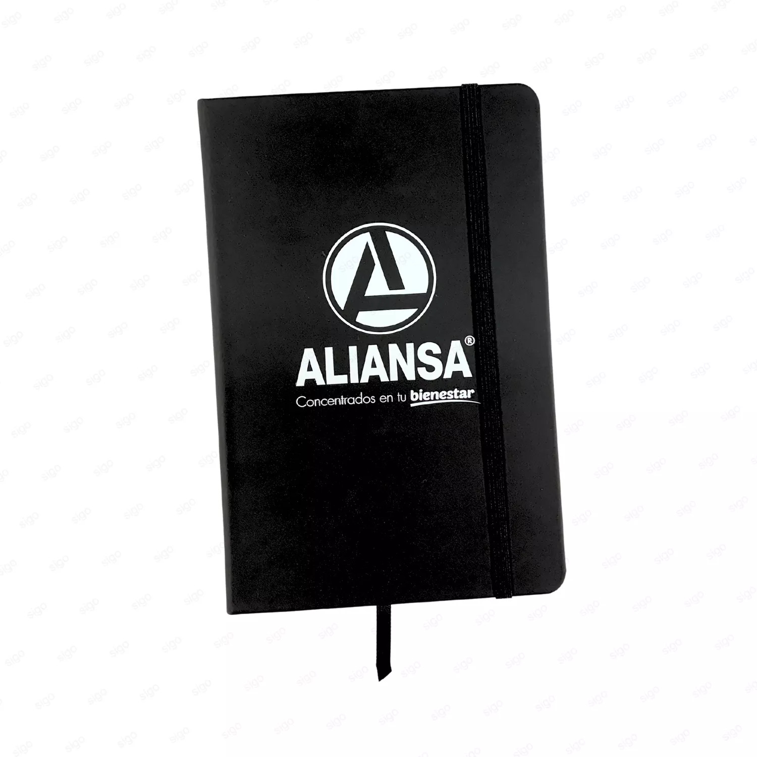 Fabricada con cubierta rígida de acabado mate negro, cinta separadora de páginas y banda elástica de cierre. Puede personalizarse con impresión en serigrafía o grabado láser, ofreciendo una presentación elegante y duradera.