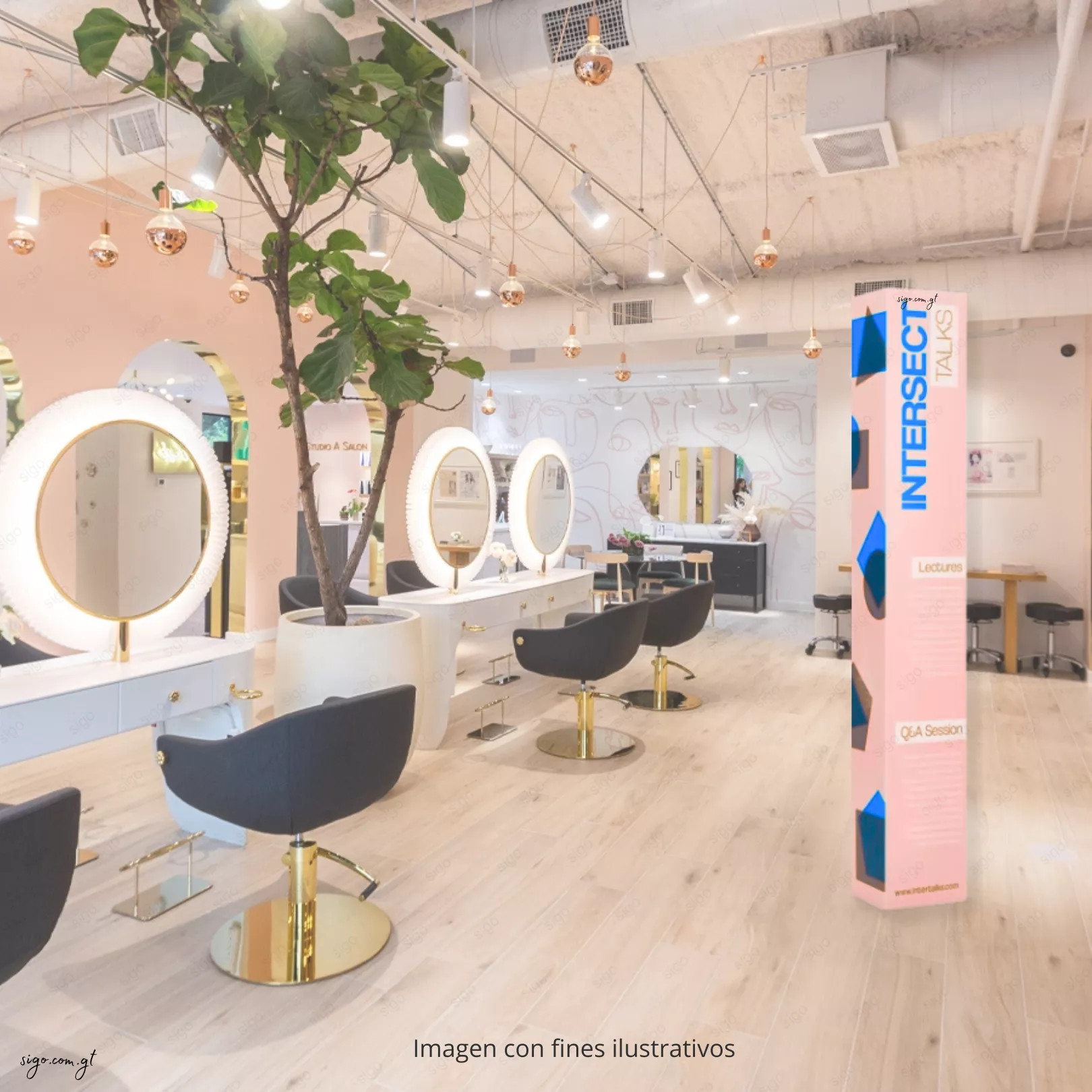 Tótem Publicitario de 4 Caras, dimensiones 33 x 200 cm. Este innovador expositor ofrece cuatro superficies de visualización para impactar desde cualquier ángulo, ideal para ferias, eventos y espacios comerciales.